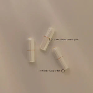 Insert the tampon gently, choosing a position that feels most comfortable for your body. Ensure it is placed securely for both comfort and protection. Change every 4–8 hours, based on your flow, to stay fresh and avoid leaks. When removing, wrap it responsibly. The outer wrap is 100 % home-compostable — simply add it to your compost — and dispose of the used tampon in your household waste.